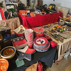 Riding Lawn Mower (not running) Electric lawn mower Gas Lawn mowers Stand up deep freezer Washer Gas dryer folding chairs computer armoir Hutch Recliners Dishes VHS/DVDs/cassettes Books Sewing Machines Pyrex Pots and Pans Small