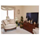 Off-White Upholstered Chair & a Half with Wood Carved Base (Approx. 53" L x 34.5" H at the back)