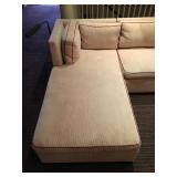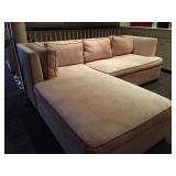 31) Pas Si Classique Armless Sofa from Ligne Roset Upholstered in Orange Ultrasuede. Two loose cushi