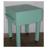 Vintage Green Paint Metal Bakers Rack with Scroll Front Feet: Upper Wire Metal Shelves over Wood W