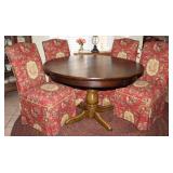 Custom Upholstered Parson Chairs shown with an Antique Oak Round Pedestal Table (48"D) and Round Rag