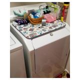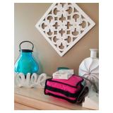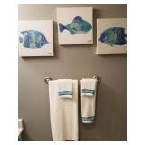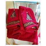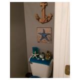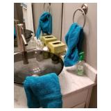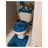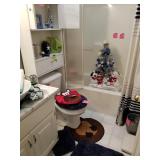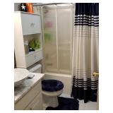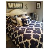 Queen bed in bag and have trash can and other bathroom accessories to match