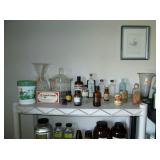 Pharmacy bottles--Beakers-spatulas-(top 2 shelves) Cards and Pill cardboard containers