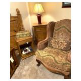 Cstom upholstered chairs with wood and leather accents. Large, upholstered ottoman