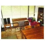 Couch--throw pillows--coffee table--floor lamp--stereo speakers in cabinet