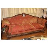 Antique Wood Carved Victorian Styled Sofa(44"x94"x24") with decorative upholstery and curved arms and camel back with carved legs **Matching Lot #2