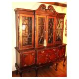 Vintage Mohogany Chippendale Style China Cabinet/Hutch with decorative design- 4 Beveled Glass front doors and inside shelves, drawer, & 3 doors at bottom with inside storage 87"x72"x23"