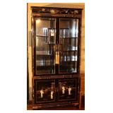 Vintage Lighted Chinese Lacquered Curio/Display Cabinet - Mother of Pearl design with hand painted details - Inside glass shelves and Mirrored Back 82.5"x38.5"x13"