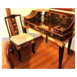 Unique Vintage Chinese Chinoiserie Design Gold and Black Lacquered finish Desk (41"x50"x19")and Matching Chair (40"x23"x18") with curved front sides and multiple draws and stationary slots with ornat