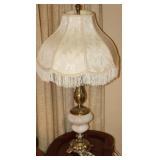 Vintage Table Lamp with Gold Tone and White Milk Glass Style - Fringe Brocade Lampshade with Scalloped Edges 30"x17" Matching Lot #26