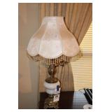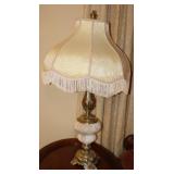 Vintage Table Lamp with Gold Tone and White Milk Glass Style - Fringe Brocade Lampshade with Scalloped Edges 30"x17" Matching Lot #25