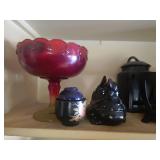 Various kitchen items including jars, a waffle maker, mugs, plates, and other kitchen wares.