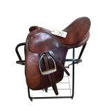 LEATHER ENGLISH STYLE SADDLE W/ STIRRUPS AND METAL SADDLE STAND