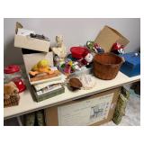 wood clock, vases, spinning wheel, various figurines