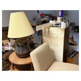 glass and wood table, brass lamp