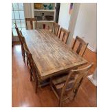 Exquisite solid wood table with seating for (8). This set has a distressed look and is in great condition….wood has a cedar look but exact match is unknown
