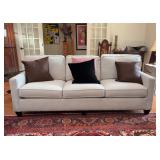 Kincaid (by La-Z-Boy) pale yellow tweed upholstery sofa….. fabric needs cleaned…..82 x 20-1/2 x 19 tall to seat (31 tall overall)…..fraying on cushion edge