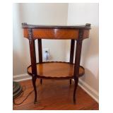 Vintage French Louis XV style oval marquetry side table, featuring two tiers, a brass gallery rail, and ormolu mounts…..23-1/2 x 15-1/2 x 28-1/2 tall….shows wear in places from normal use