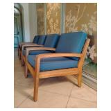 Set of 2 Christopher Knight Home Grenada Outdoor Acacia Wood Club Chairs, featuring a teak finish frame and water-resistant teal or blue cushions.