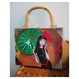 Intl. Mix small hand painted items, wooden box, shell salt/pepper shakers, missing stoppers. 13 pieces.