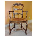 French provincial oak armchair with a hand-carved floral motif and a woven rush seat, Louis XV revival style. Back height 38", Seat height 17", Width 21 1/2". Good Condition, one broken rush strand se