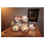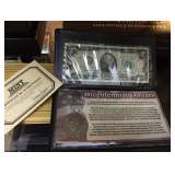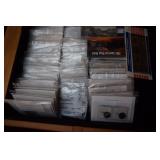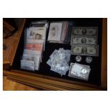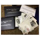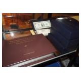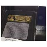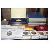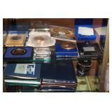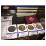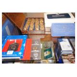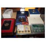 Coins: Morgan Silver dollars, Peace dollars, Pre 1964 Kennedy Halves, Washington quarters, Roosevelt dimes, Jefferson nickels and wheat pennies, American eagle silver dollars, Statue of Liberty halves, Large assortment of uncirculated coins, Statehood quarter collections, Native American dollars, Mercury dimes, Barber dimes, Indian head pennies, Liberty seated silver dimes, Braided hair large cents, Flying eagle cents, Franklin halves, Shield nickels, Nickel 3 cent pieces, Silver wartime nickels, Susan B Anthony dollars, Gold layered Indian head penny, American mint solid gold eagle replicas, State quarter proof sets, Misc proof sets, Mercury dime sets, Collector coins, Barber quarters, City of Charleston 3 dollar note, Civil war era silver certificate, Misc currency, Old foreign coins and currency, Complete collection of uncirculated Sacagawea golden dollars, World War one & two penny collections, Philadelphia, PA U.S. Mint vintage coin sets, United States mint proof sets, Lone star dollars, The official bicentennial ingots complete set, Sterling sliver collector coins, United States special mint sets, Framed coin sets, 1/4 lb solid silver statehood quarter commemorative, Foreign proof sets, Franklin mint collectors society coins, American heritage mint coins, Littleton coin company sets, Ancient coins and so much more.