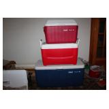 Boating, Fishing, Hunting, & Camping Coleman Polylite 100 and 40 coolers, Igloo cooler, F2 Pin Point metal detector, several camera tripods, life jackets- several incl. Body Glove, Sentry Survivor Safe, etc.