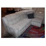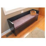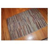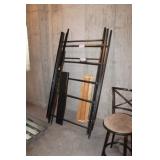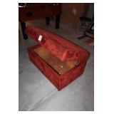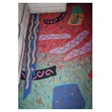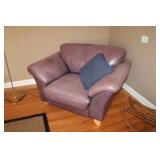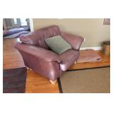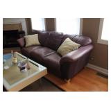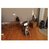 Assorted decor Black wrought iron candle holder Assorted decor Vintage Viking green glass vase Antique Seth Thomas mantel clock Dania leather sofa, as-is w/ pair of matching arm chairs Pillows Maple laminate coffee table w/ glass top Sisel rug w/ black fabric trim Vintage copper wash tub Vintage rocking horse Vintage wood box Vintage Davoser sled Modernist floor lamp Wall art Upstairs