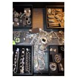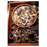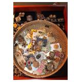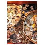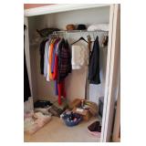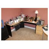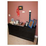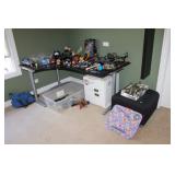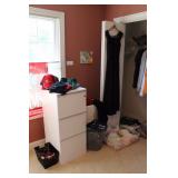 Assorted clothing Assorted decor Blankets and bedding Black dress Laminate 3-drawer cabinet w/ key Hats Office supplies Laminate desk Picture frames Laminate computer desk w/ matching 2-drawer file cabinet Table lamps Black laminate dresser IKEA laminate desk Toys Bags Ottoman Garage