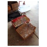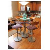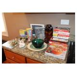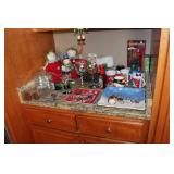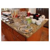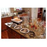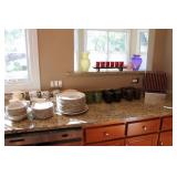 Assorted kitchenware Assorted Christmas decor Assorted dishes Assorted mugs and cups Assorted glass bakeware Assorted servingware Plasticware Mr Coffee coffee maker Cookbooks Sony Weather Band Laminate Bench w/ cushion Assorted decor Assorted glasses and stemware Glass top metal pub table w/ 4 matching bar stools Wool rug 57 pc china set, Heartland by International Tableworks Family Room
