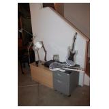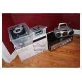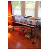 Rolling metal organizer Brother photo printer w/ supplies Assorted LPs, rock, classic rock, some real gems! U2, Beatles, Bob Dylan, 80s, Muddy Waters, Classical, etc. Assorted cords and electronics Canon i550 printer TV stand Pair of laminate end tables Pair of chrome table lamps Assorted decor Lounge chair, as-is, needs repair Boombox CD clock radio Computer accessories Vintage Yamaha Natural Sound Stereo Receiver CR-1040, as-is Media stand w/ mount, steel and glass construction Dell monitor VHS player Uniden phone Ihome system Sony Sports walkman Pioneer cd changer Carver Sonic Hologram Generator model c-9 RG acoustic processor Sony stereo receiver Headphones Large number remote Bose subwoofer Rolling office chair Assorted laptop computers Acoustic Wave music system II by Bose Assorted area rugs Dining Room