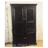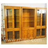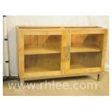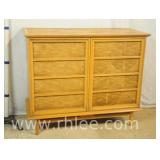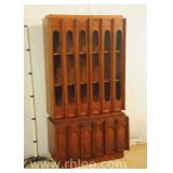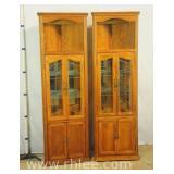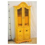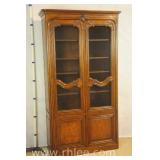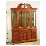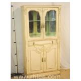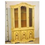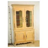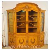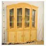 French style 2 part breakfront with raised panel doors; 74-2203 - light finish - lighted interior with mirror back and glass shelves - (missing back leg; other back leg is missing piece and cracked) - (missing 2 pulls) - 66x17x85