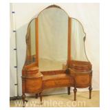 Carved walnut drop center vanity with mirror; 55-lot - (finish as-is; cloudy mirror; chips in molding) - 50x17x65
