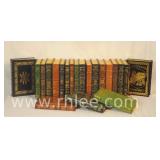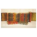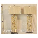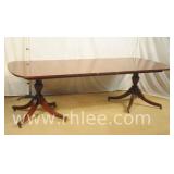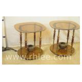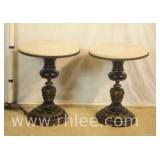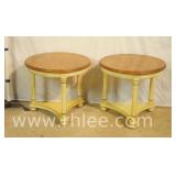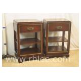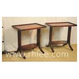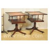 Pair of mahogany leather top 2 tier lamp tables; 55-1050 - 4 leg pedestal bases - brass toe caps and casters - (missing 1 caster) - 24x24x28.5