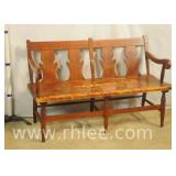 Green decorated spindle back bench with stretcher base; 55-1077 - 48x19.5x32.5