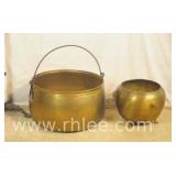 Two hammered brass pots; 528-143,144 - large one with iron handle 19x19x12 - small one with lion heads and paw feet 13.5x13.5x10