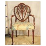 Carved mahogany shield back open arm chair; 68-627 - (finish as-is; chip on top) - 24x21.5x37.5