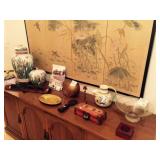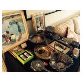 Silver-plate including some large pieces and Victorian. Fine linens, some never used and in original packaging as well as every day linens, bedding, sheets, etc . Asian art, accessories, many decorative items, including cat collectibles. House is tastefully furnished as well...Henredon sofa, barstools, side tables, dining table/pads/6 chairs, ottomans, coffee tables, Asian screen, drum table with hand painting, Queen bedroom set, sofa, console table, buffet, credenza, lucite table, lucite magazine rack, cabinets, lacquer cabinet, lamps, lighting, sofas, love seats, rugs, sheepskin rugs, a few very nice pieces of Pietra Dura.