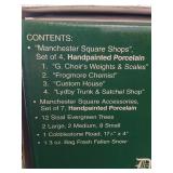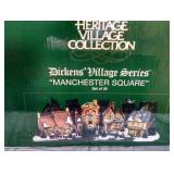 "Manchester Square" 25 piece set. Missing snow and trees but houses and figures are in excellent condition. In original box but box has been taped on edges. |