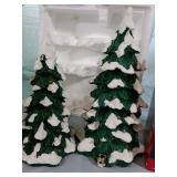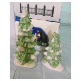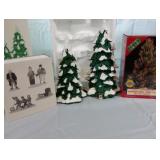 (2) Dickens' Village accessory pieces and a Lemax fibre optic shimmering spruce that would fit in with the collection.. Includes "Nicholas Nickelby", and "Lighted Snow Capped Trees" (set of 2, battery operated) All in original boxes and excellent condition. |