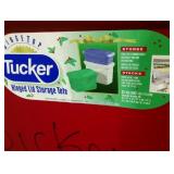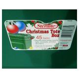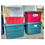 (5) storage totes used for storing Department 56 pieces. Ranging from 12 to 45 gallons and all in good used condition. The red, 35 gallon tote with green lid has broken hinges. |