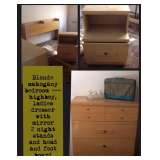 Blonde mahogany bedroom set, ladies dresser with mirror, highboy, two end tables and headboard and foot board, sold separately
