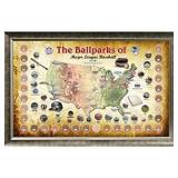 Major League Baseball Parks Map 20 inch x 32 inch Framed Collage with MLB Authentic Game Used Dirt From 30 Parks. Comes with Letter of Authenticity. New in Original Packaging. Please attend the Preview to see the item for yourself. Retail $354.99 (RT48)