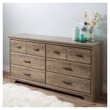 South Shore Versa 6-Drawer Double Dresser, Weathered Oak. It is enhanced by a rich finish that creates an air of sophistication in any bedroom. Modern metal handles in an Antique Copper finish. Decorative groove on the top drawer that creates the illusion of double drawers. Metal slides for smooth gliding. In Previously Opened Carton. Retail $239.99