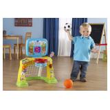 VTech Smart Shots Sports Center (Frustration Free Packaging). 2-in-1 kids basketball hoop sports center; play on the toddler basketball goal or score goals with the toddler Soccer net Animated light up LED Scoreboard Counts baskets up to 10 and plays encouraging animations, sounds and phrases; purple side lever restarts the Scoreboard Count Shape buttons introduce shapes, numbers and sounds; early learning center comes with 50+ songs, sounds and phrases Sports toy includes a basketball for shooting hoops and a Soccer ball for kicking; toddler basketball hoop develops motor skills Educational toy meant for toddlers between 1 and 3 years old; operates on 3 AA batteries (not included); Frustration free packaging means it comes easier to open in a plain brown box Item is in factory box. Retail Price $29.88 |