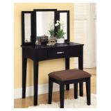 Furniture Of America,CM-DK6490BK, Potterville Black Vanity Table With Stool And Mirror Set. Enjoy some much needed personal grooming space with this attractive vanity and stool set. This versatile vanity is a perfect bedroom accent piece with a spacious table top has room for an array of cosmetics, jewelry and beauty supplies. Table and Vanity Bench feature unadorned details such as the straight and curved lines, slightly flared legs, profile-edged top, and gold hardware pull. Stool has a polyester fabric cover in chocolate finish. Vanity set comes in four color options: Cherry, Espresso, White and Black Finish. Furniture is made of solid rubberwood and selected veneers. To clean, use damp cotton cloth to wipe clean. Overall: Stool:18 1/4"L X 13"W X 17 3/4"H. Vanity Table: 32"L X 16"W X 30"H. Mirror: 30 3/4"L X 20 1/2"W X 3/4"H. In original box. Retail $259.00. |