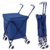 VersaCart,112691, TRANSIT Folding Cart. Imagine the load this sturdy, easy-rolling folding cart will take off you and your back! Lightweight at only 9 lb. empty, this patented thick-gauge tubular steel frame folding cart easily carries 120 lb of cargo and then some, yet folds up in a snap for compact storage in your trunk or closet. Use it for grocery, mall shopping, laundry, picnics, camping and so much more. The extra large detachable heavy-duty nylon canvas bag measures 21"H x 17"W x 18"D for a generous 3.72 cu ft capacity. The bag has handles, a fitted cover and is coated for water-resistance. Features thick ergonomic easy-grip handles and double wheels all around for maneuverability and stability. Color: Navy. In original box. Retail $69.95. |