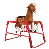 Rockin' Rider Lucky Talking Plush Spring Horse sings the exclusive "I'm a Little Pony" song when his right ear is pressed and says 6 fun talking phrases with sound effects when his left ear is pressed. Your child will be amazed by Lucky's synchronized moving mouth when he sings and talks. The soft and huggable plush is preferred by both Moms and Kids. Other features include motion-activated galloping sounds, 3-position stirrups, easy-grip handles, realistic mane and tail, detailed colorful saddle, embroidered eyes, sturdy steel frame and durable spring covers. Parents can select the volume level that's right for their home. Some assembly is required. Saddle height is 26 inches. Requires 3 AA batteries included. Lucky is recommended for ages 2 to 5 years and up to 65 lbs. Overall: 31 x 22 x 11 inches. In original box. Retail $165.99. |