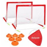 GoSports Portable Pop-Up Soccer Goals, Set of 2, With Cones and Case. The GoSports Pop-Up Soccer Goals are designed to provide the ultimate pair of portable goals for training, scrimmages or games. The set includes 2 Goals that fold flat and weigh under 3 pounds total. The goals do not require any assembly, but rather 'pop' open for immediate use. To close them, you simply twist and fold them into a flat shape and store them in the included carrying case so they can be taken anywhere. The goals are made from premium nylon fabric and netting that can withstand even the strongest shots. The goals can be staked into the grass using the included stakes, or can be taped onto the ground if you are playing on a hard-court (tape not included). The goals are lined in a high-visibility reflective fabric so they can be used in low-light conditions. These are great for many different applications: youth soccer games, goalie-less games, skills training and more. The set also includes 6 cones that allow you to mark the 4 corners as well as the field half. Size: 6'. In original box. Retail $90.78. |