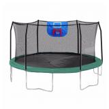 Skywalker Trampolines 15-Feet Jump N' Dunk Trampoline with Safety Enclosure and Basketball Hoop. Box 1/2 only, please attend preview to ensure completion of this product. Reinforced t-bracket construction provides greater structural stability at each enclosure and trampoline joint. Patented no-gap enclosure System attaches net to jump mat at each spring, eliminating gaps. Tightly woven polyethylene enclosure net for excellent durability and UV protection. Woven jump mat made of heavy-duty UV protected polypropylene to prevent slipping Meets or exceeds ASTM safety standards. Safe play basketball hoop and ball made of soft materials. Basketball hoop features break away Velcro rim to ensure minimum impact on enclosure net and poles. BOX 1 of 2 ONLY, INCOMPLETE. Item is in retail packaging! Retail $329.99 |